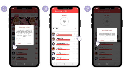 Apenas confirmas tu correo y entras a la aplicación, Choeaedol te da la opción de elegir un idol, solo debes buscar “V BTS” y dar click sobre el corazón y la estrella.