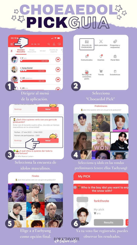 Los corazones diarios desaparecen todos los días a la hora de reinicio de Choeaedol, 11:30 pm KST. Utiliza los corazones diarios para votar por Taehyung en la comunidad de la aplicación.